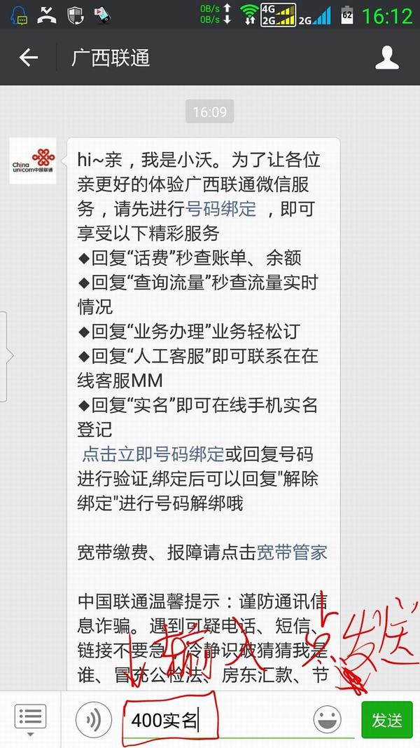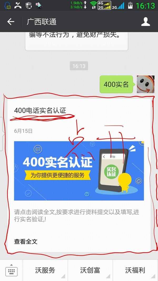 微信添加好友“廣西聯(lián)通”,關(guān)注后,在下邊輸入“400實名”后點擊頁面。上傳營業(yè)執(zhí)照,身份證等照片,填寫云盤生成的鏈接及密碼點確定,顯示下單成功。認(rèn)證結(jié)束,等聯(lián)通結(jié)果就可以了